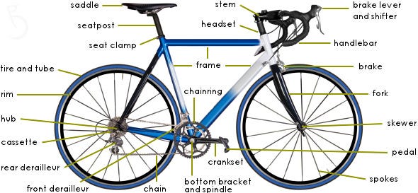 A few things to know about road bikes and somewhat serious to serious cyclists. There are a lot of fun gadgets. Bikes are a dream for tinkerers. There are lots of parts, breaks - rim or disc, brake levers, the tires and rims, front and back derailleurs. The saddle, the pedals. Everything!